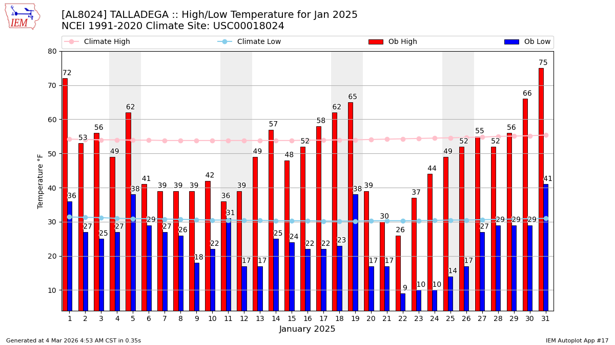 Description: This chart of the monthly temperature data. The bars are the observations and the dots are climatology.