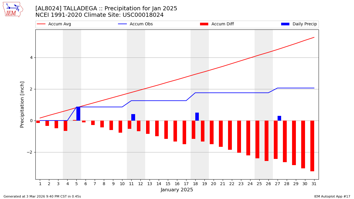 Description: This chart is of daily precipitation for the month. The red line would be an average month while the blue line and bars are observations.