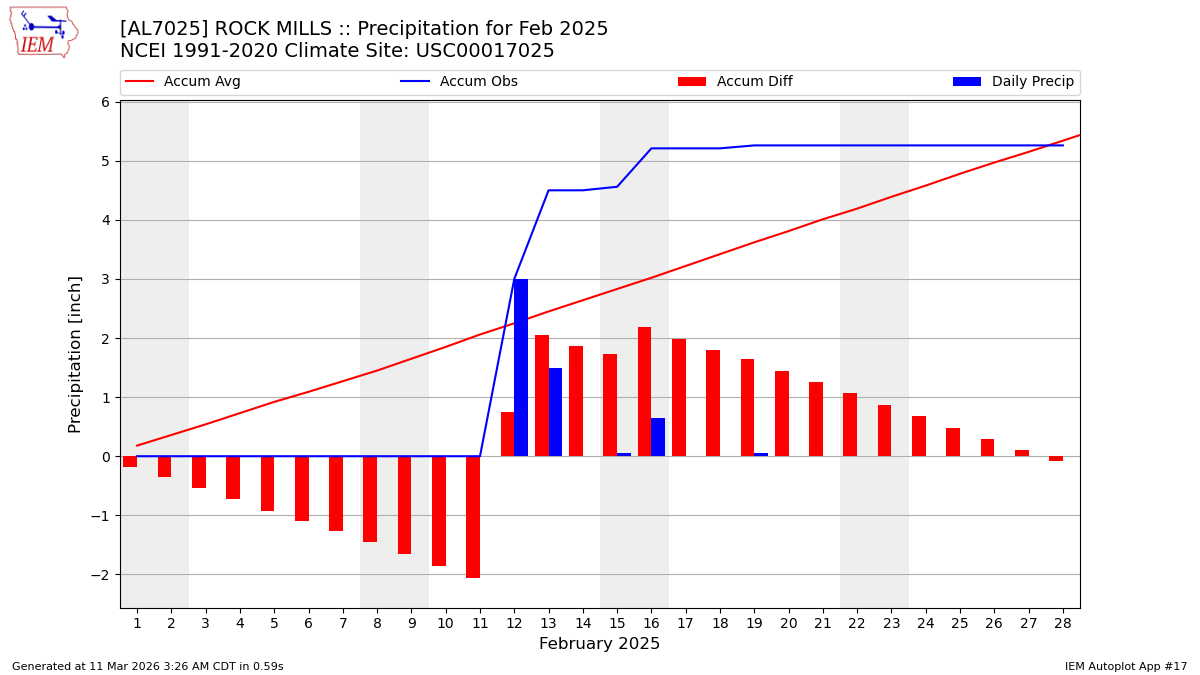 Description: This chart is of daily precipitation for the month. The red line would be an average month while the blue line and bars are observations.