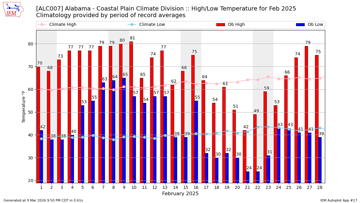 Description: This chart of the monthly temperature data. The bars are the observations and the dots are climatology.