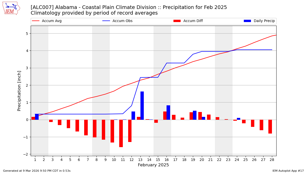 Description: This chart is of daily precipitation for the month. The red line would be an average month while the blue line and bars are observations.