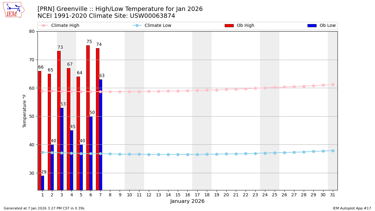 Description: This chart of the monthly temperature data. The bars are the observations and the dots are climatology.