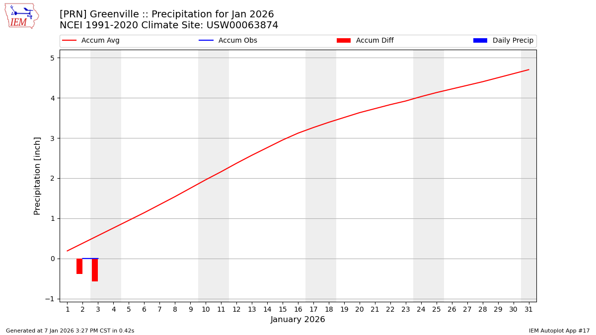 Description: This chart is of daily precipitation for the month. The red line would be an average month while the blue line and bars are observations.