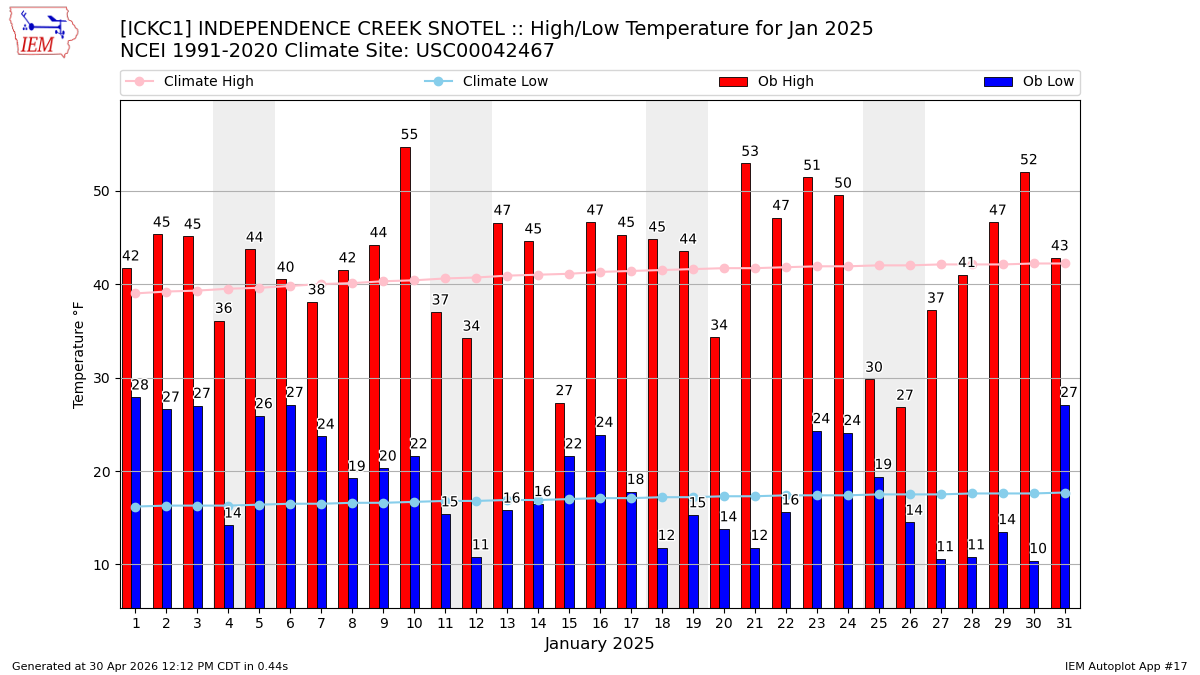| 12 High: 34.2 Low: 10.8 Precip: M Snow Depth: 13 | 13 High: 46.58 Low: 15.8 Precip: M Snow Depth: 13 | 14 High: 44.6 Low: 16.5 Precip: M Snow Depth: 13 | 15 High: 27.3 Low: 21.6 Precip: M Snow Depth: 13 | 16 High: 46.6 Low: 23.9 Precip: 0.00 Snow Depth: 13 | 17 High: 45.3 Low: 17.8 Precip: 0.00 Snow Depth: 13 | 18 High: 44.8 Low: 11.8 Precip: M Snow Depth: 13 |