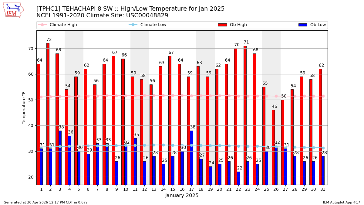 Description: This chart of the monthly temperature data. The bars are the observations and the dots are climatology.