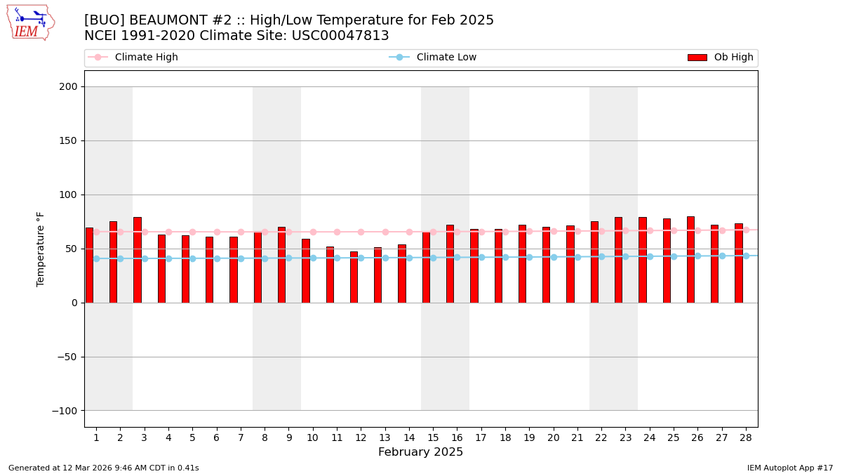 Description: This chart of the monthly temperature data. The bars are the observations and the dots are climatology.