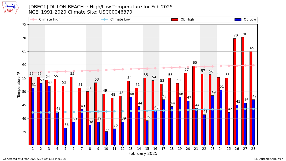 Description: This chart of the monthly temperature data. The bars are the observations and the dots are climatology.
