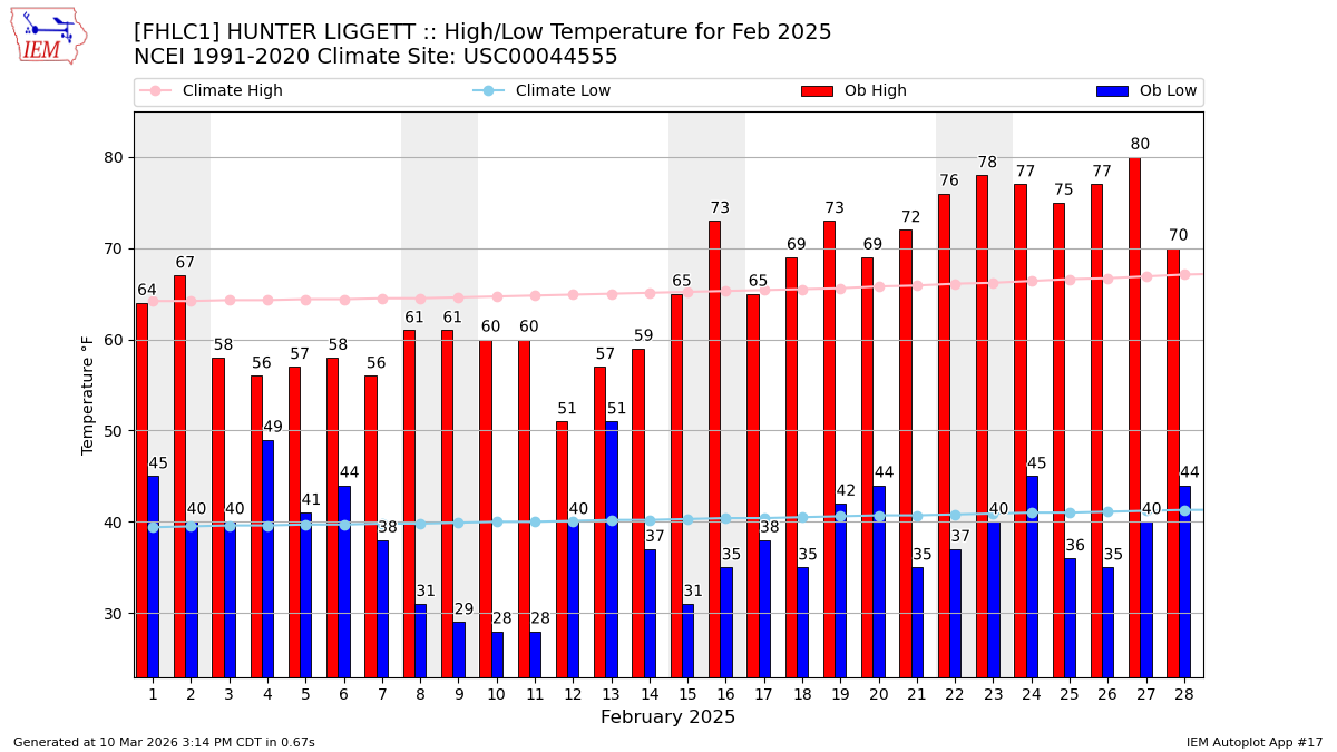 Description: This chart of the monthly temperature data. The bars are the observations and the dots are climatology.