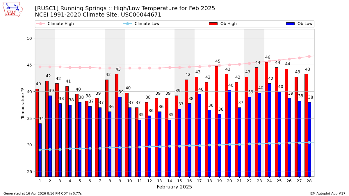 Description: This chart is of daily precipitation for the month. The red line would be an average month while the blue line and bars are observations.