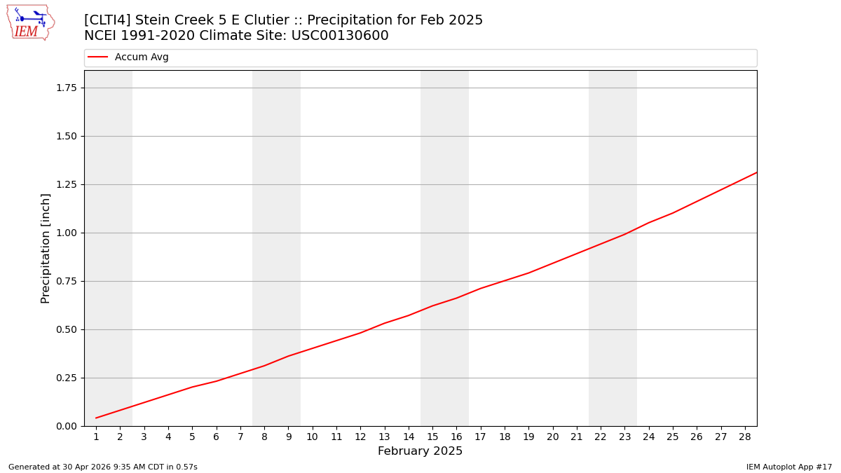 Description: This chart is of daily precipitation for the month. The red line would be an average month while the blue line and bars are observations.