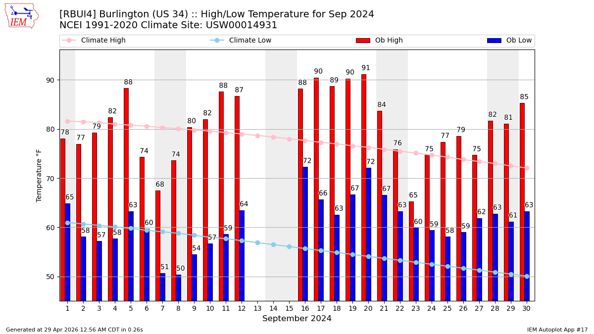 Description: This chart of the monthly temperature data. The bars are the observations and the dots are climatology.