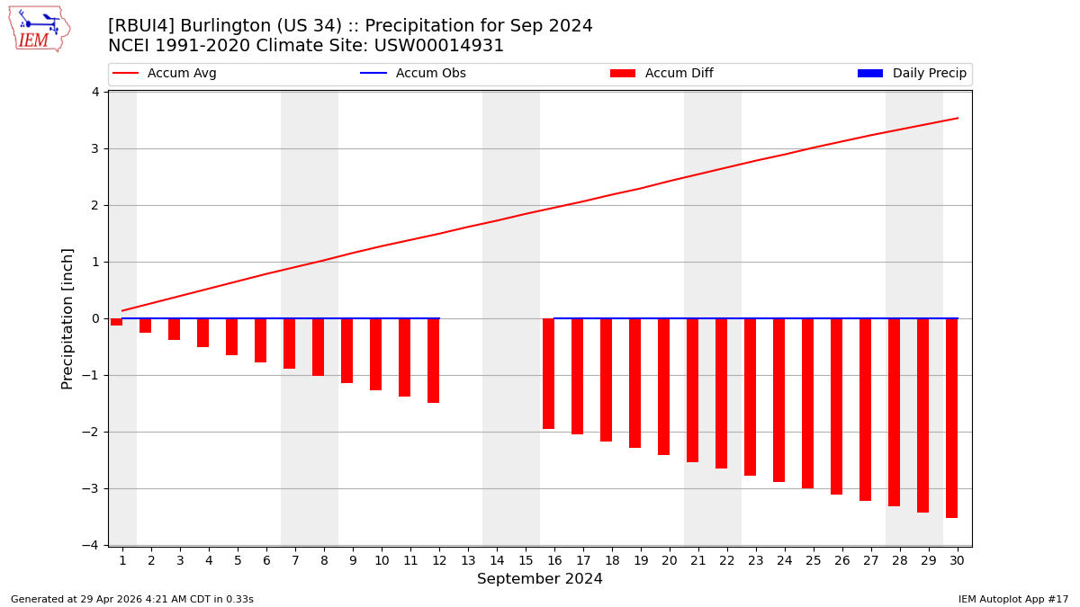 Description: This chart is of daily precipitation for the month. The red line would be an average month while the blue line and bars are observations.