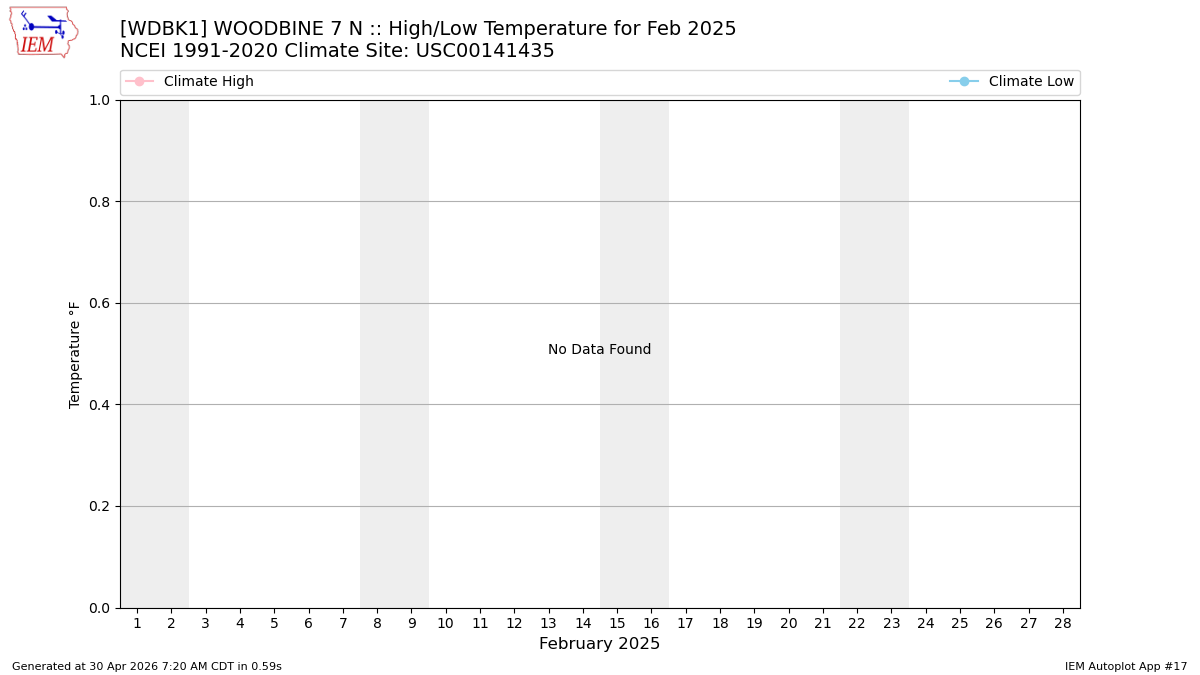 The calendar chart below shows the daily reported climate variables. You can click on a date to display the values for all sites for that day. Time stamps are displayed in the America/Chicago timezone. Wind speeds are in mph and temperatures in Fahrenheit. Values flagged with a (E) are estimated by the IEM.