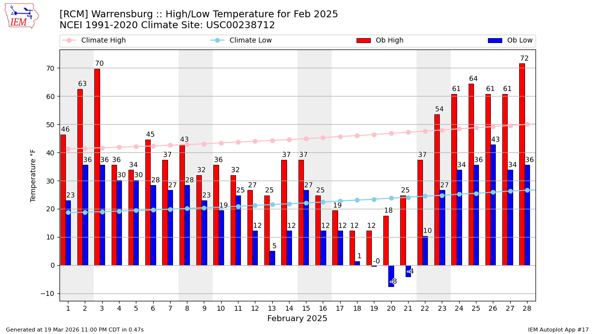 Description: This chart of the monthly temperature data. The bars are the observations and the dots are climatology.