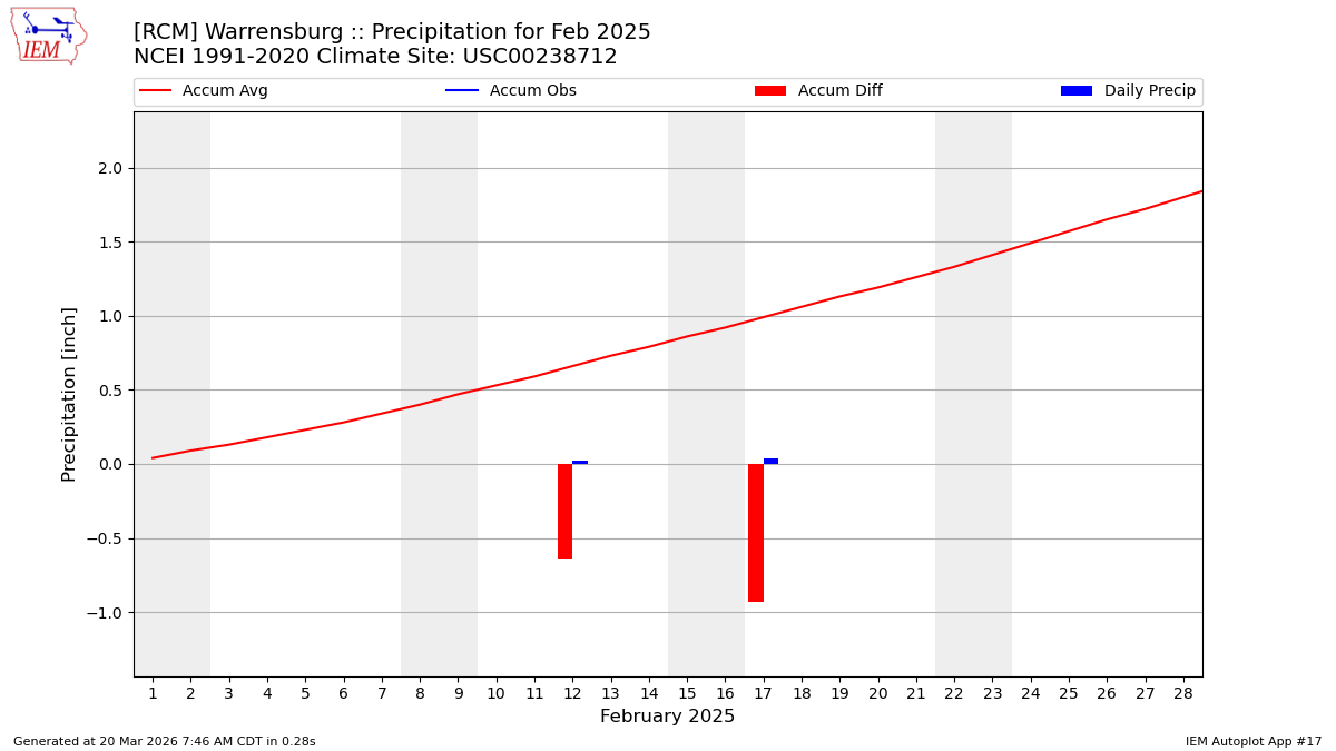 Description: This chart is of daily precipitation for the month. The red line would be an average month while the blue line and bars are observations.