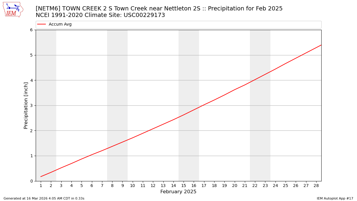 Description: This chart is of daily precipitation for the month. The red line would be an average month while the blue line and bars are observations.