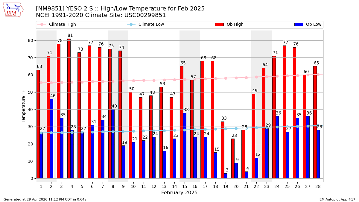 Description: This chart of the monthly temperature data. The bars are the observations and the dots are climatology.