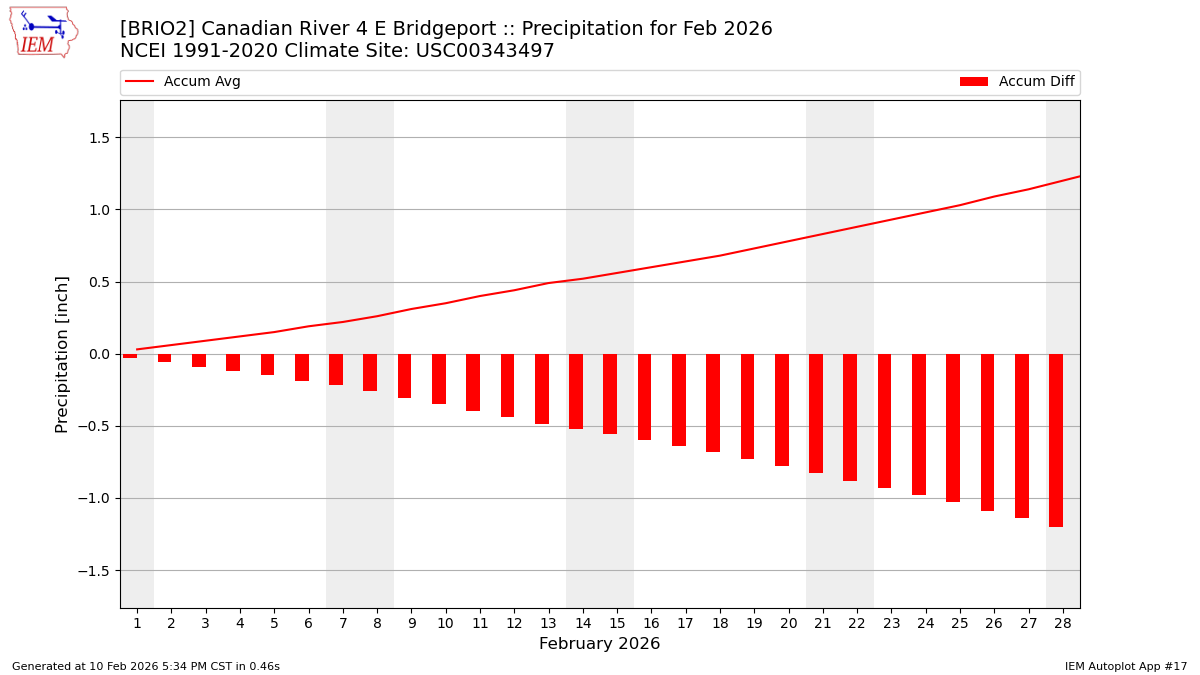 Description: This chart is of daily precipitation for the month. The red line would be an average month while the blue line and bars are observations.