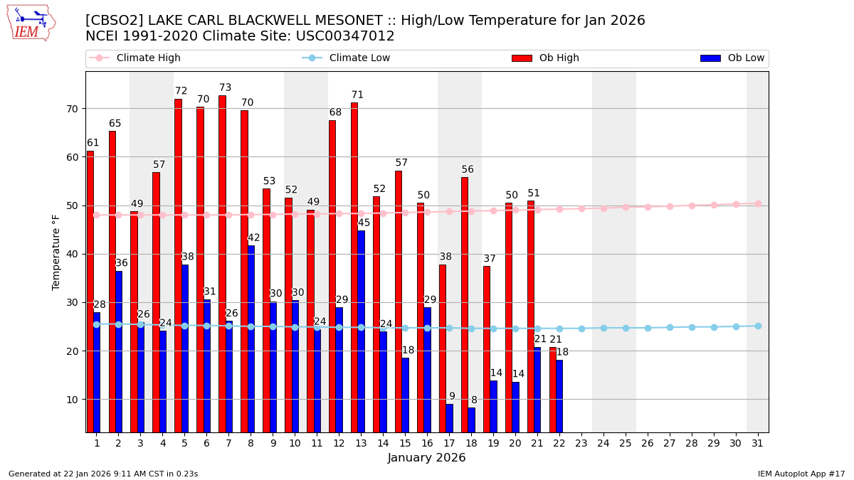 Description: This chart of the monthly temperature data. The bars are the observations and the dots are climatology.