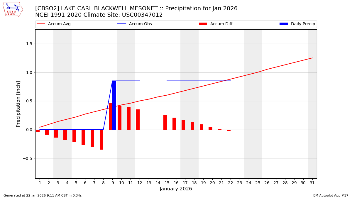 Description: This chart is of daily precipitation for the month. The red line would be an average month while the blue line and bars are observations.
