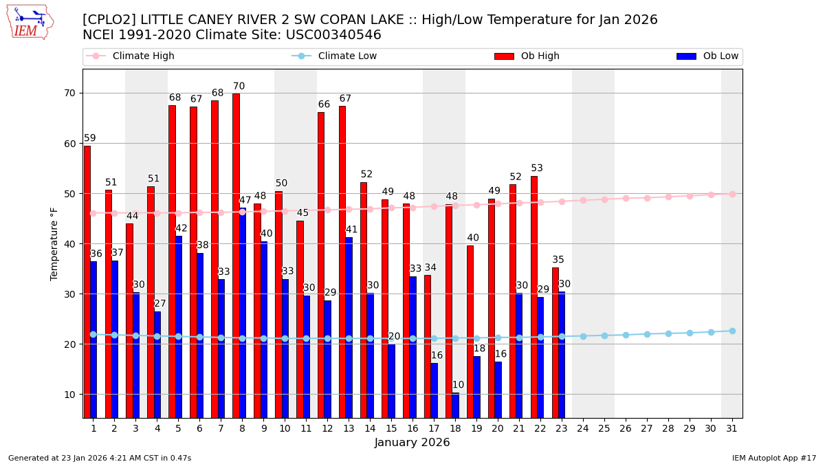 | 11 High: 44.58 Low: 29.68 Precip: M Max Stage[ft]: 710.82 RH% Min/Max: 23-75 Feel Min/Max: 24 to 45 | 12 High: 66.18 Low: 28.72 Precip: M Max Stage[ft]: 710.88 RH% Min/Max: 22-67 Feel Min/Max: 25 to 66 | 13 High: 67.35 Low: 41.25 Precip: M Max Stage[ft]: 710.94 RH% Min/Max: 23-55 Feel Min/Max: 40 to 67 | 14 High: 52.27 Low: 30.16 Precip: M Max Stage[ft]: 711.12 RH% Min/Max: 32-76 Feel Min/Max: 26 to 52 | 15 High: 48.79 Low: 19.98 Precip: M Max Stage[ft]: 710.86 RH% Min/Max: 32-82 Feel Min/Max: 16 to 44 | 16 High: 47.91 Low: 33.48 Precip: M Max Stage[ft]: 710.67 RH% Min/Max: 32-84 Feel Min/Max: 28 to 44 | 17 High: 33.69 Low: 16.2 Precip: M Max Stage[ft]: 710.72 RH% Min/Max: 41-66 Feel Min/Max: 10 to 25 |