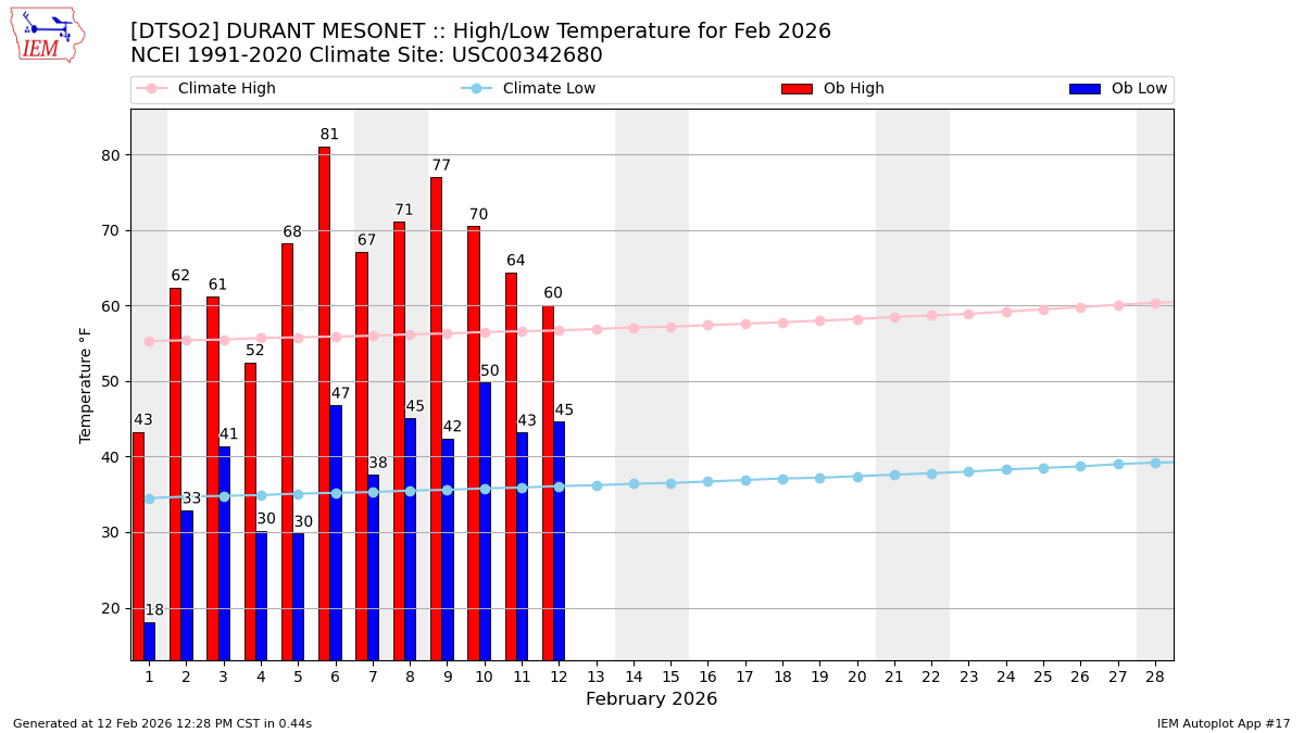 Description: This chart of the monthly temperature data. The bars are the observations and the dots are climatology.