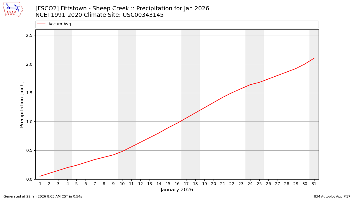 Description: This chart is of daily precipitation for the month. The red line would be an average month while the blue line and bars are observations.