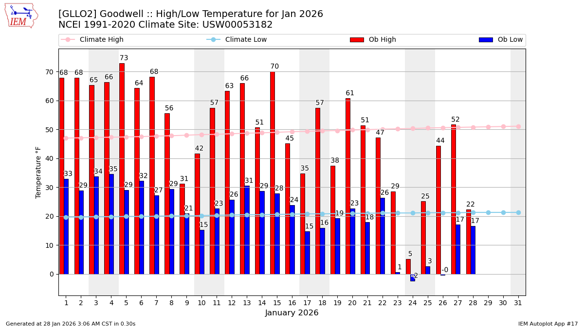 Description: This chart of the monthly temperature data. The bars are the observations and the dots are climatology.