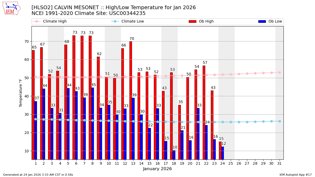 Description: This chart of the monthly temperature data. The bars are the observations and the dots are climatology.
