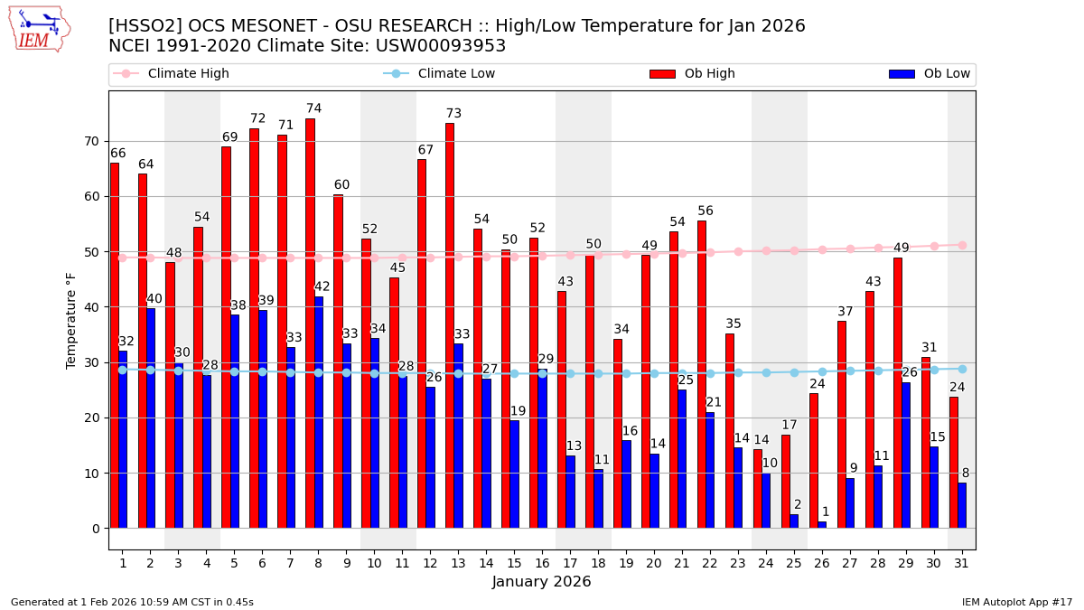 Description: This chart of the monthly temperature data. The bars are the observations and the dots are climatology.