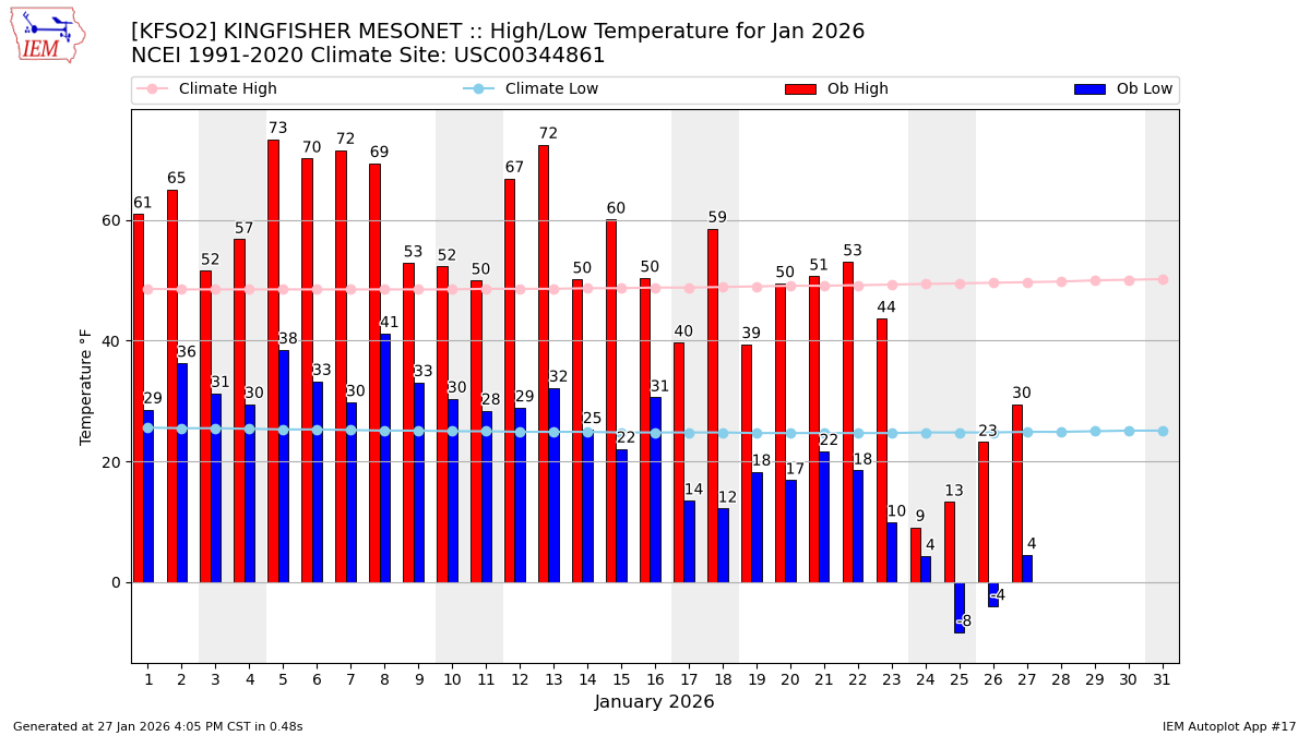 Description: This chart of the monthly temperature data. The bars are the observations and the dots are climatology.