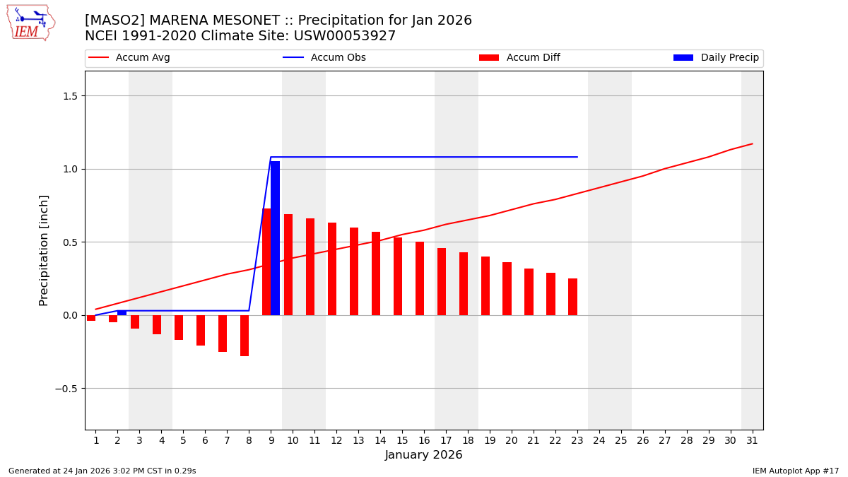 Description: This chart is of daily precipitation for the month. The red line would be an average month while the blue line and bars are observations.