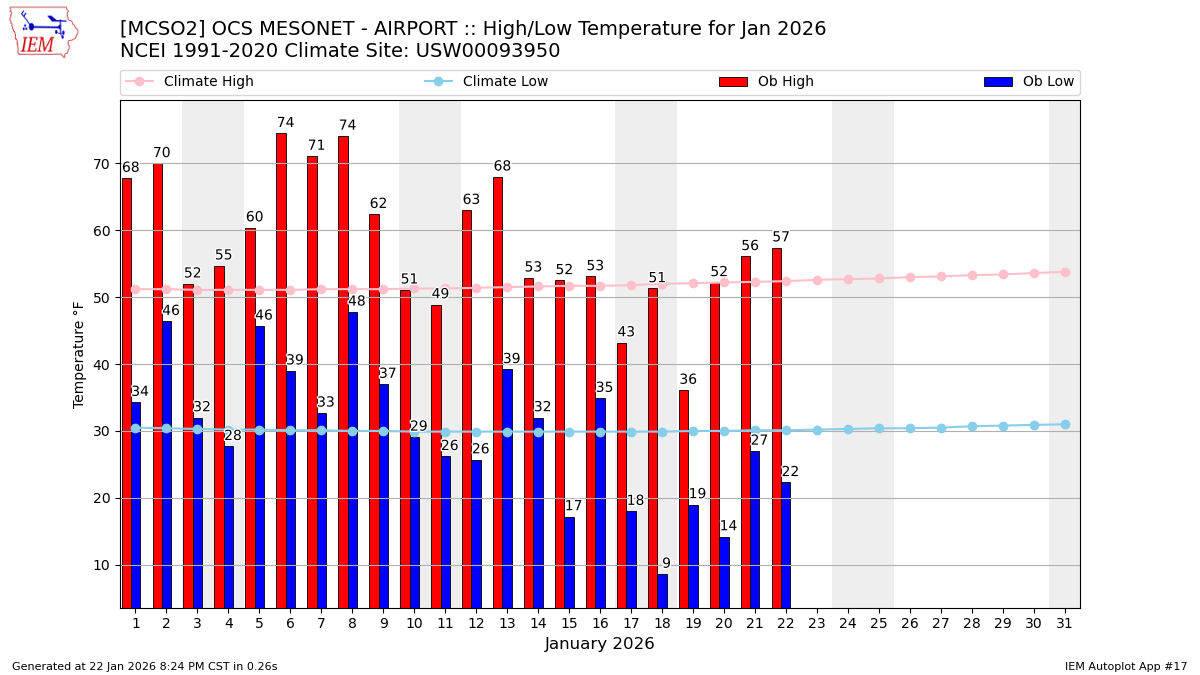 Description: This chart of the monthly temperature data. The bars are the observations and the dots are climatology.