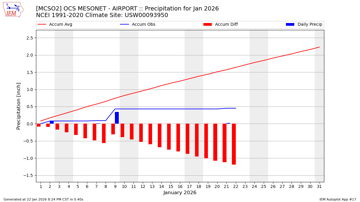 Description: This chart is of daily precipitation for the month. The red line would be an average month while the blue line and bars are observations.