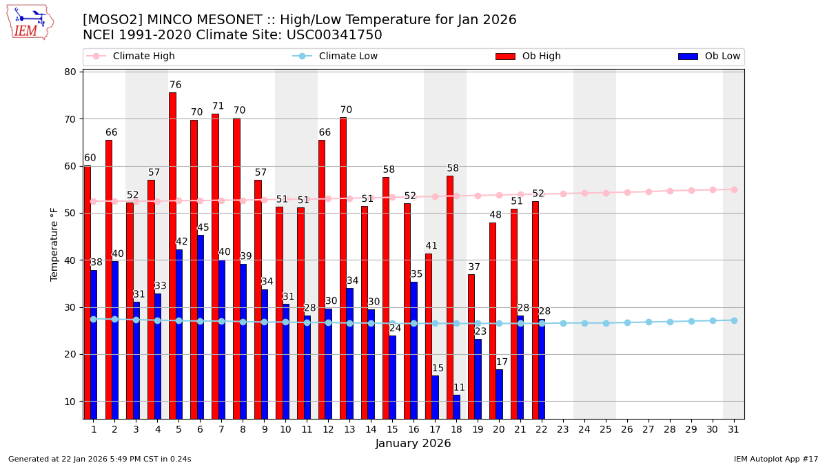 Description: This chart of the monthly temperature data. The bars are the observations and the dots are climatology.