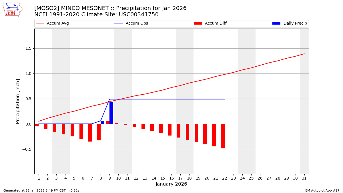 Description: This chart is of daily precipitation for the month. The red line would be an average month while the blue line and bars are observations.