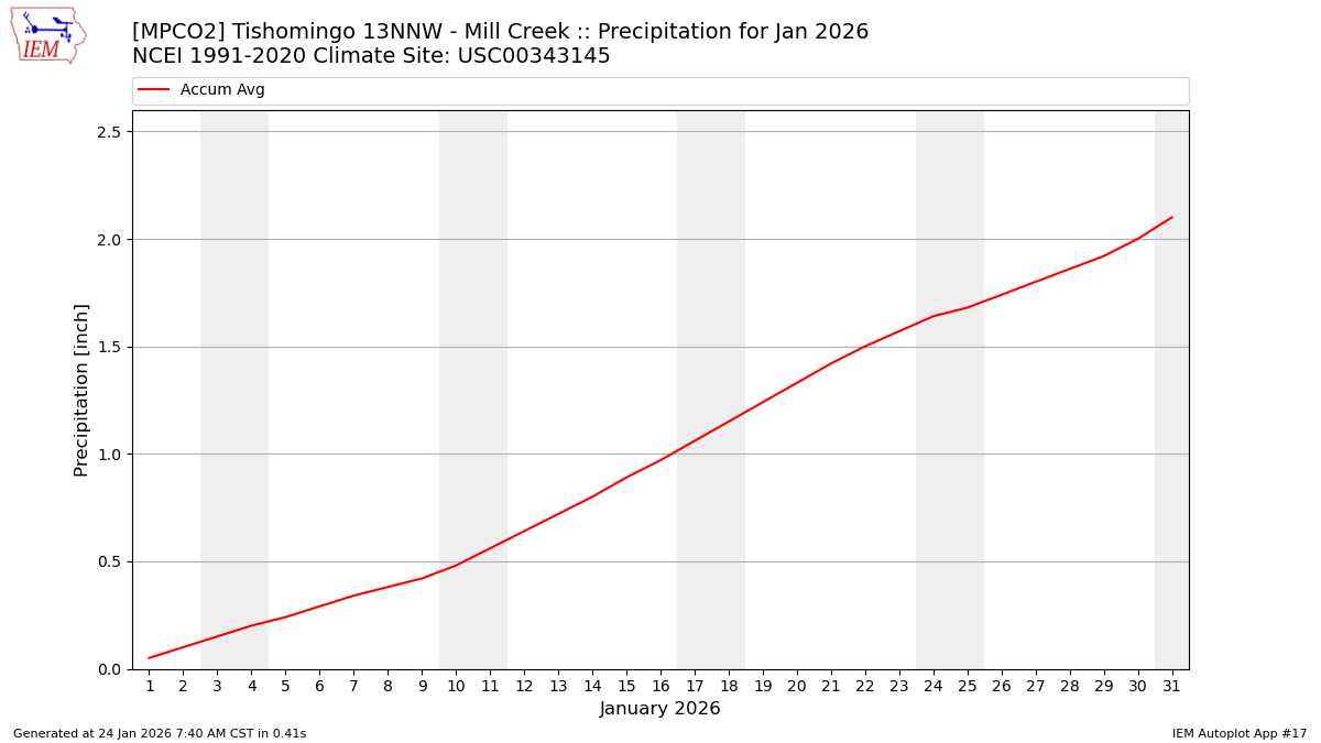 Description: This chart is of daily precipitation for the month. The red line would be an average month while the blue line and bars are observations.