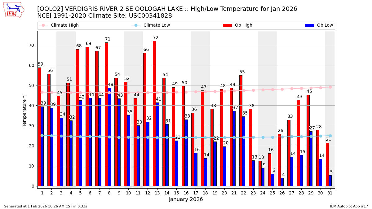 | 25 High: 16.3 Low: 6.15 Precip: M Max Stage[ft]: 638.28 RH% Min/Max: 60-89 Feel Min/Max: -11 to 7 | 26 High: 25.84 Low: 3.97 Precip: M Max Stage[ft]: 638.17 RH% Min/Max: 46-80 Feel Min/Max: -11 to 19 | 27 High: 32.92 Low: 14.49 Precip: M Max Stage[ft]: 638.14 RH% Min/Max: 57-80 Feel Min/Max: 7 to 30 | 28 High: 42.67 Low: 15.35 Precip: M Max Stage[ft]: 638.14 RH% Min/Max: 39-84 Feel Min/Max: 11 to 40 | 29 High: 45.34 Low: 27.14 Precip: M Max Stage[ft]: 638.18 RH% Min/Max: 48-81 Feel Min/Max: 18 to 45 | 30 High: 27.73 Low: 13.53 Precip: M Max Stage[ft]: 638.24 RH% Min/Max: 52-73 Feel Min/Max: -1 to 21 | 31 High: 21.49 Low: 5.36 Precip: M Max Stage[ft]: 638.14 RH% Min/Max: 45-80 Feel Min/Max: -7 to 21 |