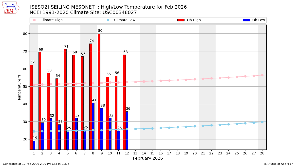 Description: This chart of the monthly temperature data. The bars are the observations and the dots are climatology.