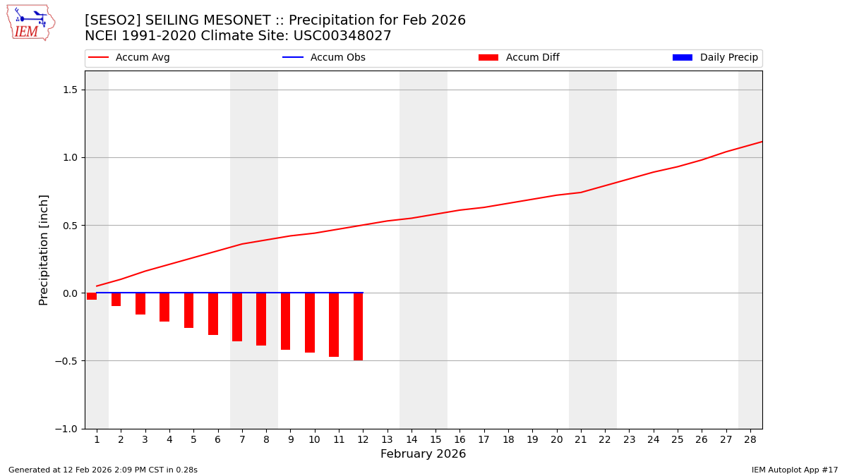 Description: This chart is of daily precipitation for the month. The red line would be an average month while the blue line and bars are observations.