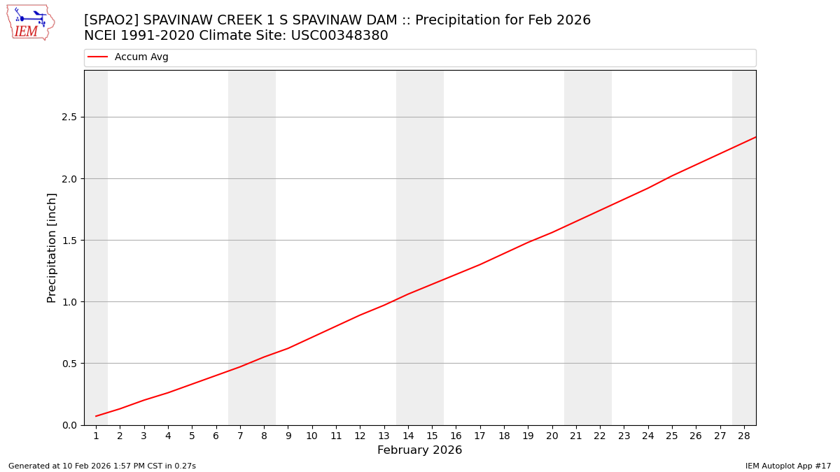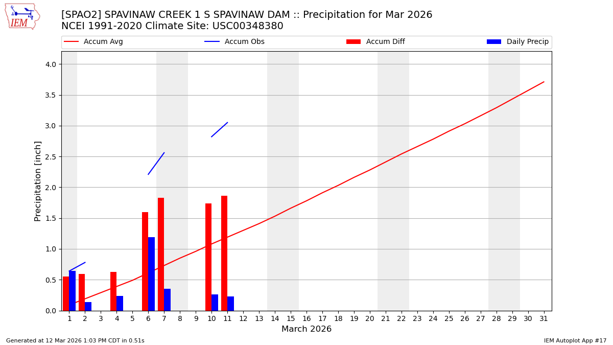 Description: This chart is of daily precipitation for the month. The red line would be an average month while the blue line and bars are observations.