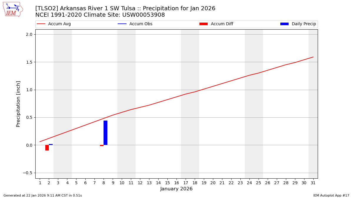 Description: This chart is of daily precipitation for the month. The red line would be an average month while the blue line and bars are observations.