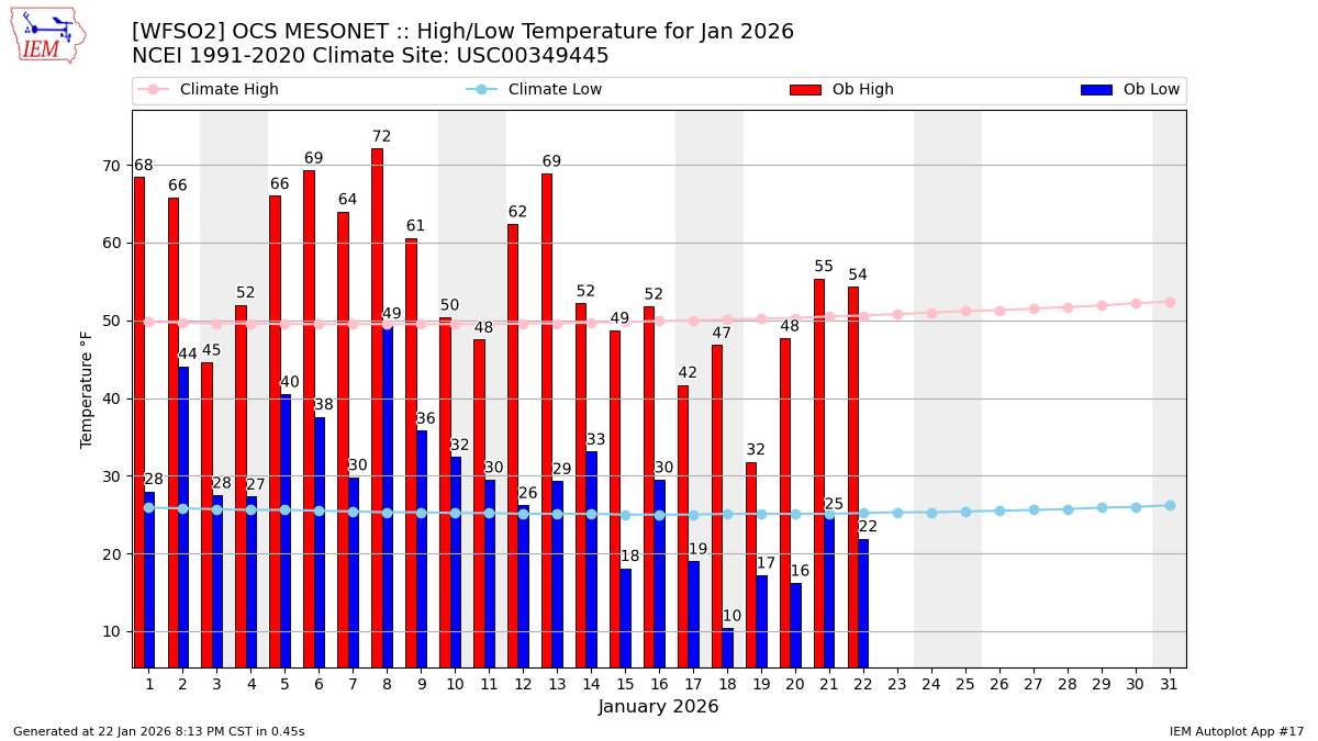 Description: This chart of the monthly temperature data. The bars are the observations and the dots are climatology.