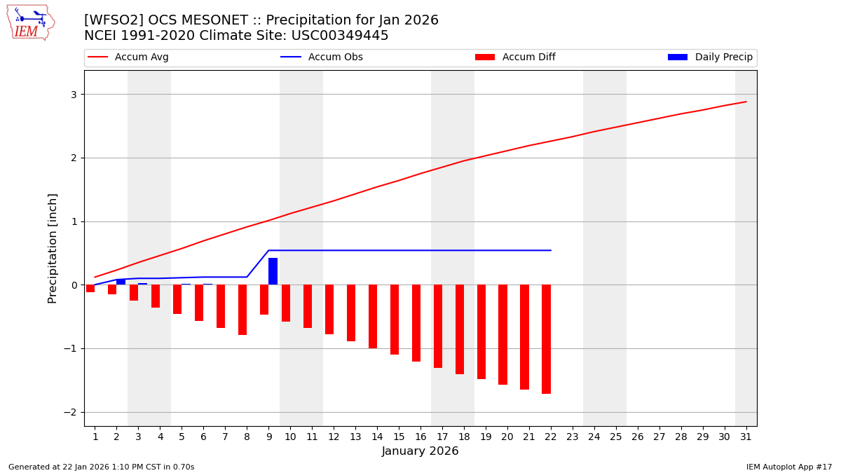 Description: This chart is of daily precipitation for the month. The red line would be an average month while the blue line and bars are observations.