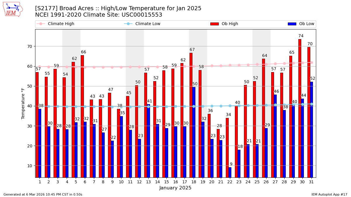 Description: This chart of the monthly temperature data. The bars are the observations and the dots are climatology.