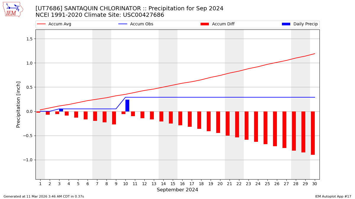 Description: This chart is of daily precipitation for the month. The red line would be an average month while the blue line and bars are observations.