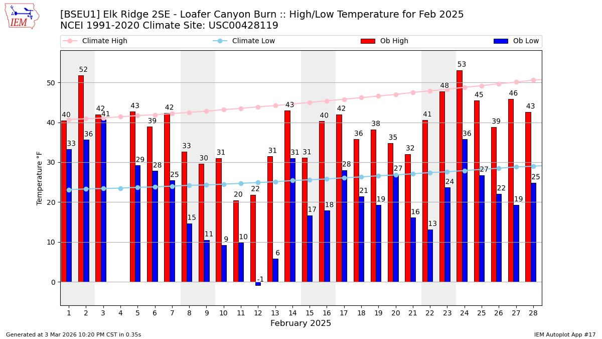 Description: This chart of the monthly temperature data. The bars are the observations and the dots are climatology.