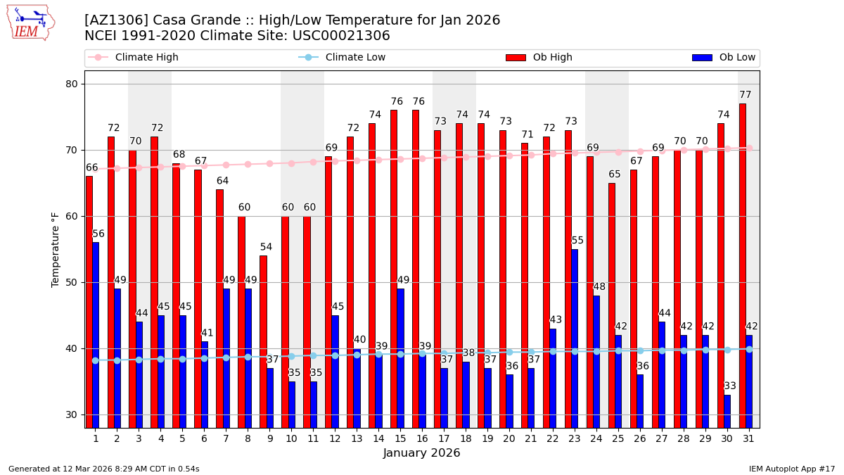 Description: This chart of the monthly temperature data. The bars are the observations and the dots are climatology.