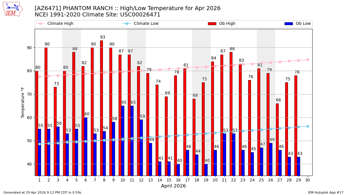 | 05 (@18) High: 88 Low: 55 Precip: 0.00 Snow: 0 Snow Depth: 0 | 06 (@18) High: 82 Low: 60 Precip: Trace Snow: 0 Snow Depth: 0 | 07 (@18) High: 90 Low: 53 Precip: 0.00 Snow: 0 Snow Depth: 0 | 08 (@18) High: 93 Low: 54 Precip: 0.00 Snow: 0 Snow Depth: 0 | 09 (@18) High: 90 Low: 58 Precip: 0.00 Snow: 0 Snow Depth: 0 | 10 (@18) High: 87 Low: 65 Precip: 0.00 Snow: 0 Snow Depth: 0 | 11 (@18) High: 87 Low: 65 Precip: 0.00 Snow: 0 Snow Depth: 0 |