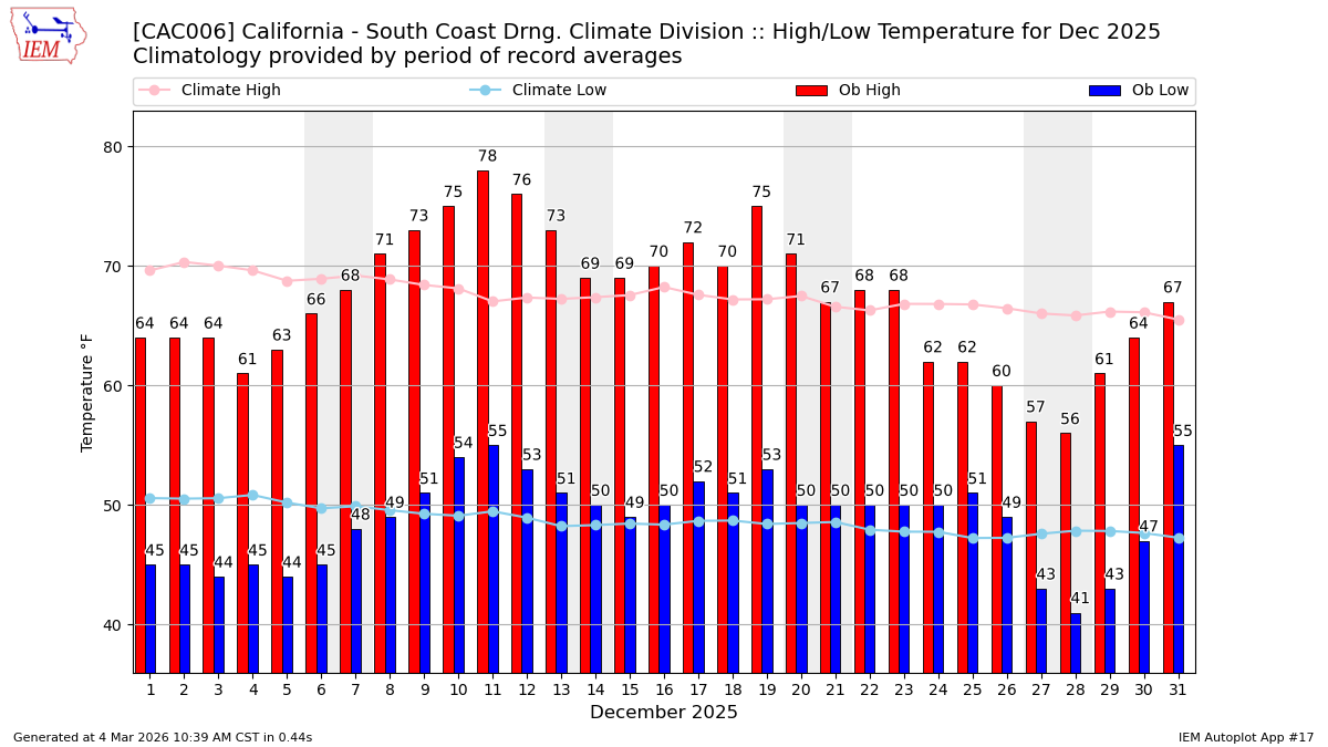 Description: This chart of the monthly temperature data. The bars are the observations and the dots are climatology.